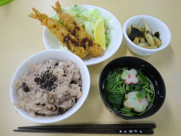 赤飯・エビフライ・若竹煮・すまし汁
