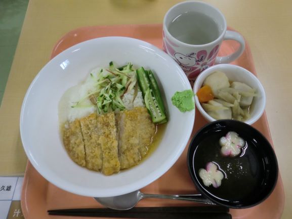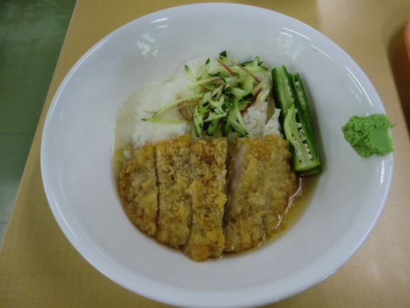 冷やし出汁カツ丼・ごぼうと里芋の味噌煮・すまし汁