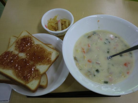 食パン・苺ジャム・クラムチャウダー・大根サラダ
