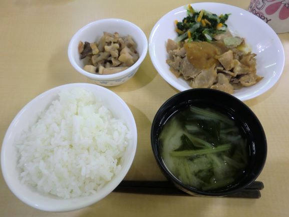 御飯・ポークソテーりんごソース・レンコンのベーコン炒め・味噌汁