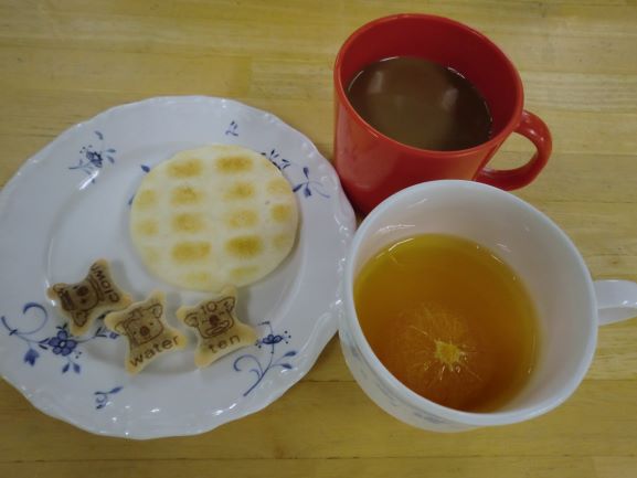 丸ごとみかんゼリー・せんべい・コアラのマーチ・コーヒー